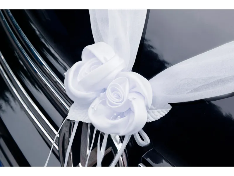 Girlandy z organzy w kolorze białym, z kremowymi różyczkami, długość pojedynczej girlandy 1,8 metra. Idealne do dekoracji samochodu i stołu. Do kompletu proponujemy kokardki KT1. (1 op. / 2 szt.)