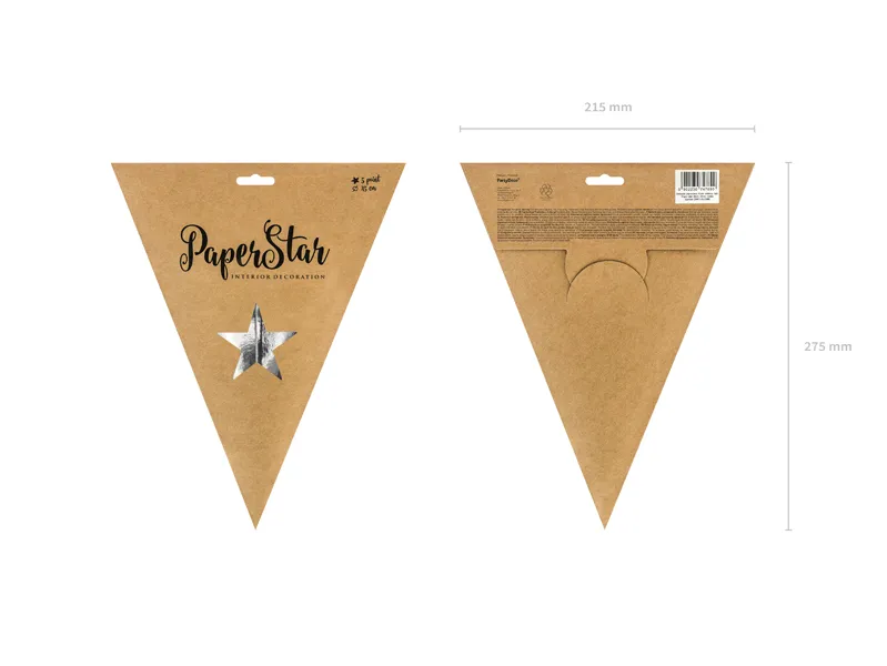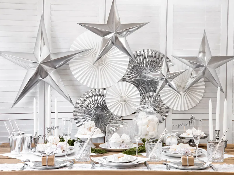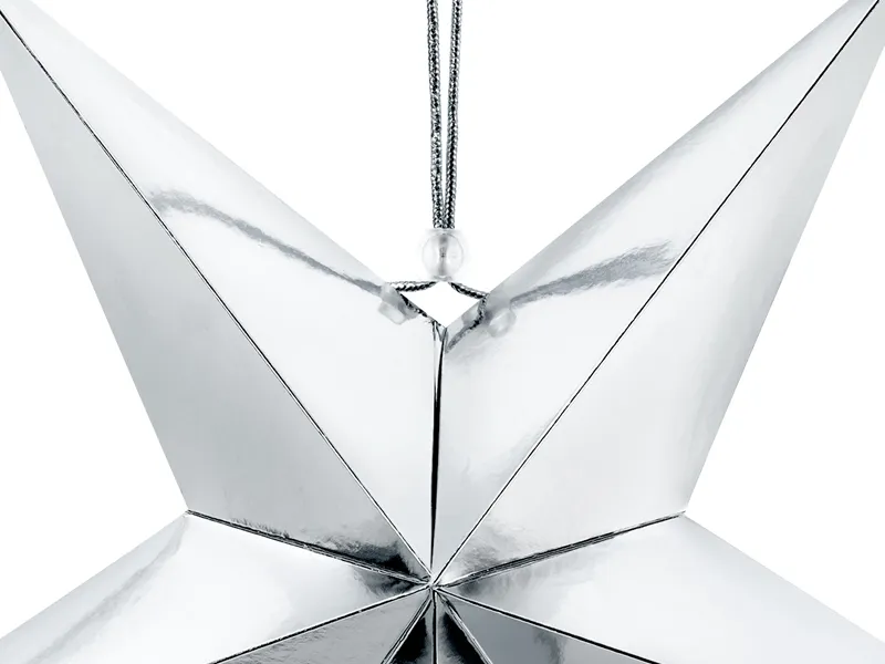 Gwiazda papierowa pięcioramienna wykonana ze srebrnego lustrzanego papieru, ze srebrnym sznurkiem, średnica ok. 45 cm. Produkt do samodzielnego złożenia.