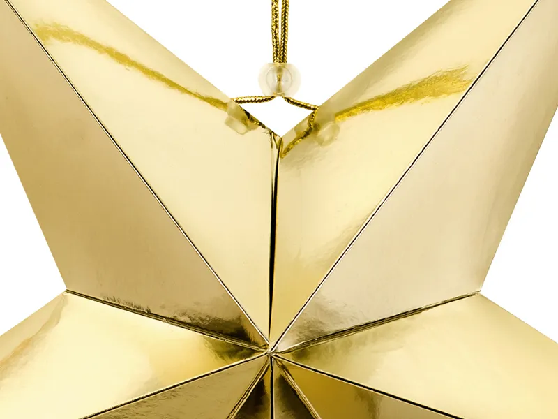 Gwiazda pięcioramienna wykonana ze złotego lustrzanego papieru, ze złotym sznurkiem, średnica ok. 70 cm. Produkt do samodzielnego złożenia.