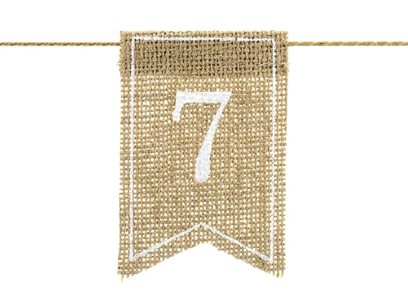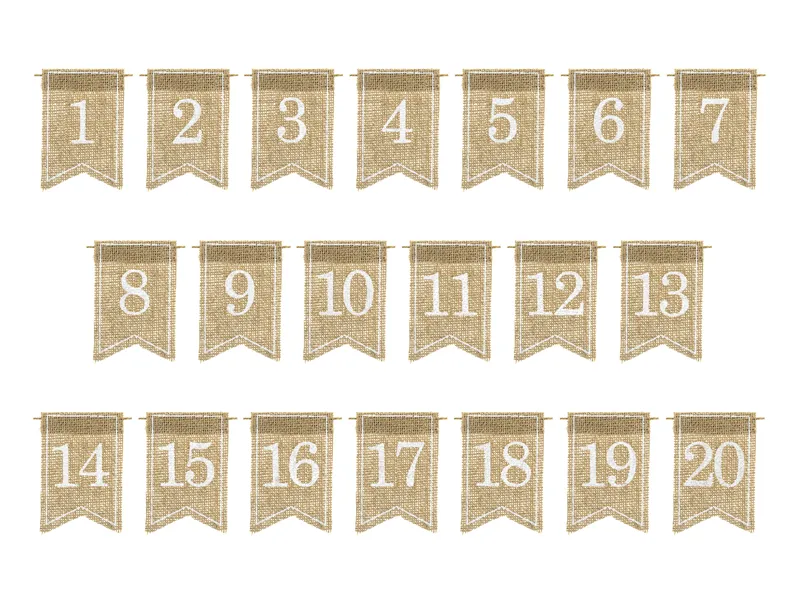 Numery na stół wykonane z juty z białym nadrukiem, zestaw zawiera numery od 1 do 20 na sznurku, wymiary: szerokość ok. 7 cm, wysokość ok. 10,5 cm, długość całkowita ok. 37 cm. (1 op. / 20 szt.)