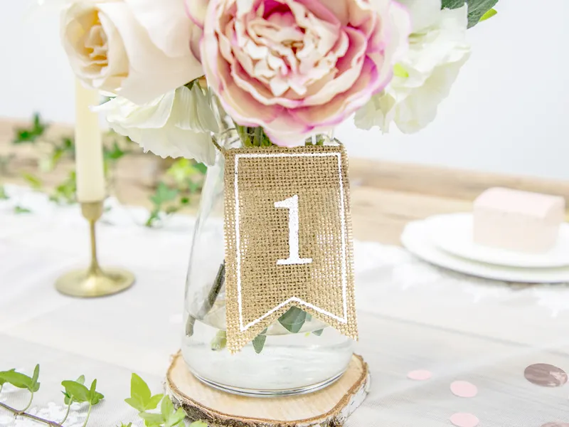 Jutowe numery na stół białe 7×10.5 cm (1 op. / 20 szt.)