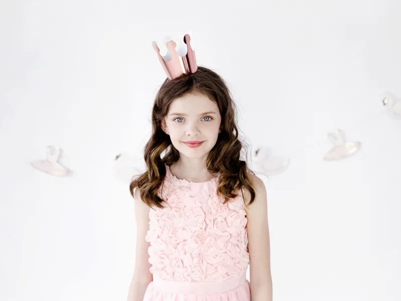 Korona Party wykonana z papieru lustrzanego w kolorze różowego złota, wymiary po złożeniu: wysokość ok. 9 cm, średnica ok. 6 cm. (1 op. / 6 szt.)