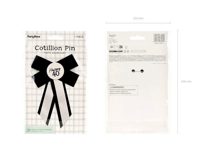 Kotylion na 40 urodziny w kolorze kremowo-czarnym, wymiary ok. 11 x 17 cm. Kotylion wyposażony jest w agrafkę.
