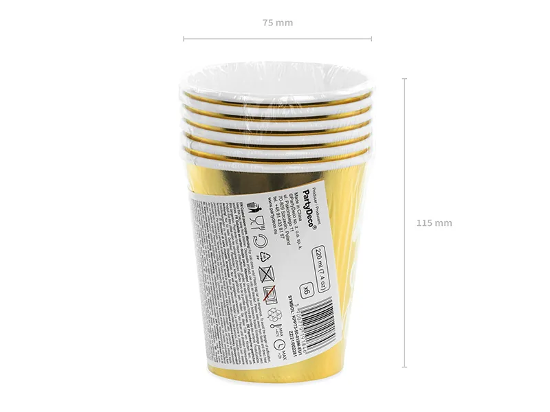 Kubeczki papierowe w kolorze złotym metalizowanym z białym napisem 50th Birthday!, pojemność ok 220 ml (7.4 oz). Kubki na napoje zawierają oznaczenia wymagane przez Rozporządzenie wykonawcze Komisji (UE) 2020/2151 z dnia 17 grudnia 2020 r. ustanawiające zasady dotyczące zharmonizowanych specyfikacji w odniesieniu do oznakowania produktów jednorazowego użytku z tworzyw sztucznych wymienionych w części D załącznika do dyrektywy Parlamentu Europejskiego i Rady (UE) 2019/904 w sprawie zmniejszenia wpływu niektórych produktów z tworzyw sztucznych na środowisko. Produkt zawiera etykietę wyłącznie w języku polskim, niemieckim, czeskim, francuskim, niderlandzkim, słowackim, słoweńskim i bułgarskim. (1 op. / 6 szt.)