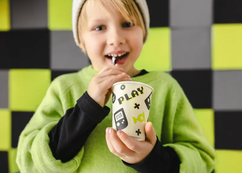 Już chwila z kubkiem odbieranym z ręki pozwala poczuć że uczestniczy się w wydarzeniu z gry. Grafiką nawiązujące do konsolowej nostalgii i nowoczesnego designu sprawiają że kubeczki stają się częścią spójnej scenografii bez względu na to czy wypełnione są sokiem, wodą czy napojem dla dorosłych.