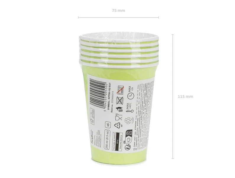 Kubeczki papierowe w kolorze jasnozielonym. Wysokość ok. 9 cm, pojemność ok. 250 ml (8.5 oz). Produkt jednorazowego użytku. Nie używać do gorących napojów. Kubki na napoje zawierają oznaczenia wymagane przez Rozporządzenie wykonawcze Komisji (UE) 2020/2151 z dnia 17 grudnia 2020 r. ustanawiające zasady dotyczące zharmonizowanych specyfikacji w odniesieniu do oznakowania produktów jednorazowego użytku z tworzyw sztucznych wymienionych w części D załącznika do dyrektywy Parlamentu Europejskiego i Rady (UE) 2019/904 w sprawie zmniejszenia wpływu niektórych produktów z tworzyw sztucznych na środowisko. Produkt zawiera etykietę wyłącznie w języku polskim, niemieckim, czeskim, francuskim, niderlandzkim, słowackim, słoweńskim i bułgarskim. (1 op. / 6 szt.)