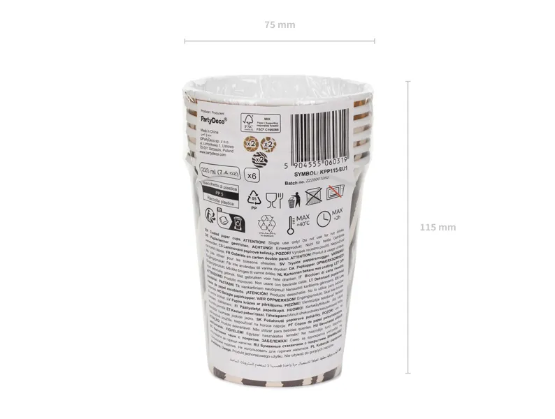 Kubeczki papierowe Safari. Zestaw zawiera 6 szt. kubeczków w 3 wzorach z cętkami zebry, lamparta i żyrafy. Wysokość ok. 9 cm, pojemność ok. 220 ml (7.4 oz). Produkt jednorazowego użytku. Nie używać do gorących napojów. Kubki na napoje zawierają oznaczenia wymagane przez Rozporządzenie wykonawcze Komisji (UE) 2020/2151 z dnia 17 grudnia 2020 r. ustanawiające zasady dotyczące zharmonizowanych specyfikacji w odniesieniu do oznakowania produktów jednorazowego użytku z tworzyw sztucznych wymienionych w części D załącznika do dyrektywy Parlamentu Europejskiego i Rady (UE) 2019/904 w sprawie zmniejszenia wpływu niektórych produktów z tworzyw sztucznych na środowisko. Produkt zawiera etykietę wyłącznie w języku polskim, niemieckim, czeskim, francuskim, niderlandzkim, słowackim, słoweńskim i bułgarskim. (1 op. / 6 szt.)