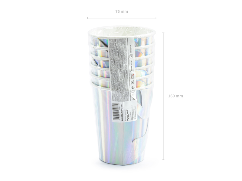 Kubeczki Syrenka wykonane z papieru w kolorze opalizującym z uchem w kształcie ogonka, pojemność ok. 220 ml. (1 op. / 6 szt.)