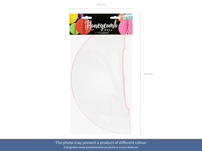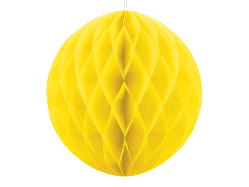 Kula bibułowa w kolorze żółtym, o średnicy około 10 centymetrów. Produkt wielokrotnego użytku. Montaż przy pomocy spinacza.