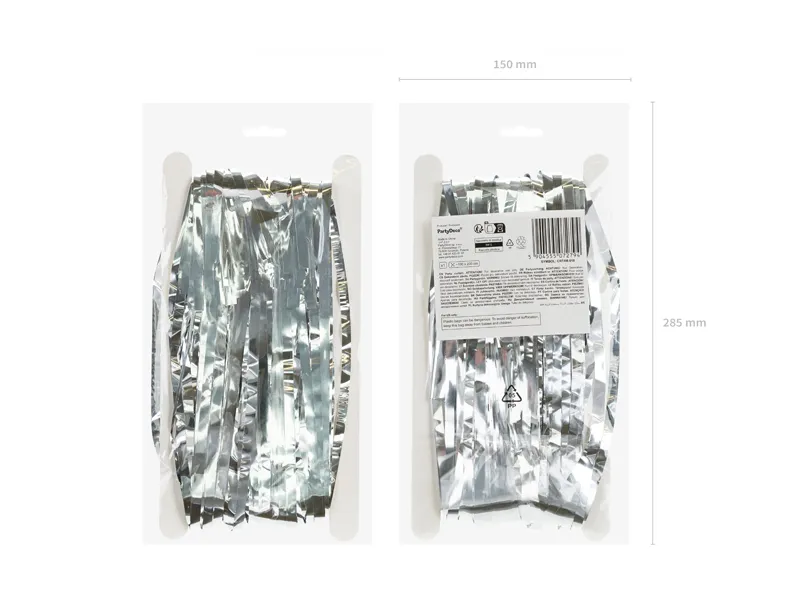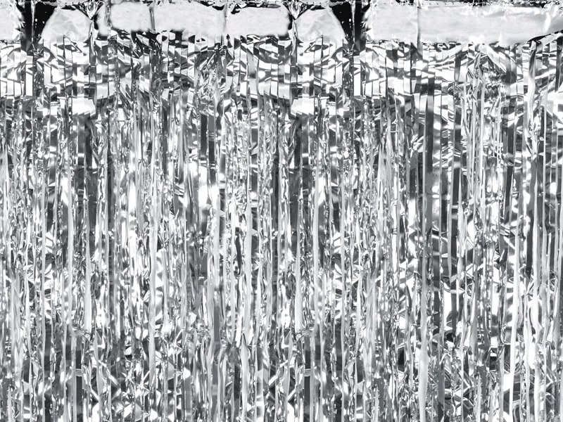 Kurtyna Party metalizowana w kolorze srebrnym, szerokość ok. 100 cm, wysokość ok. 200 cm. Wykonana z folii o grubości 23 µm.
