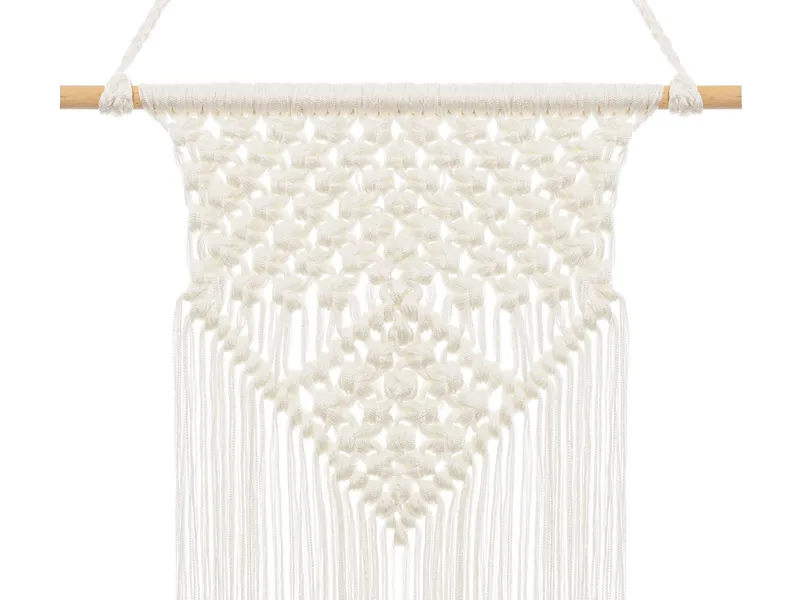 Makrama w kolorze złamanej bieli, wymiary ok. 30 x 49 cm.