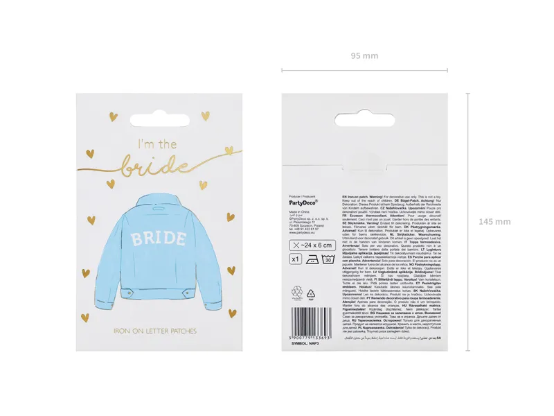 Naprasowanka z napisem „BRIDE” w kolorze białym, o wymiarach dwadzieścia cztery na sześć centymetrów, to stylowy i efektowny sposób na wyróżnienie przyszłej panny młodej w wyjątkowy, a zarazem subtelny sposób. Może być aplikowana na t-shirty, bluzy, szlafroki, torby, kosmetyczki lub inne tekstylia, tworząc personalizowany element garderoby idealny na wieczór panieński, poranek ślubny, sesję zdjęciową lub przygotowania w dniu ślubu. Biała kolorystyka sprawia, że naprasowanka doskonale komponuje się z tłem w niemal każdej barwie, zachowując przy tym elegancki, czysty i kobiecy charakter.