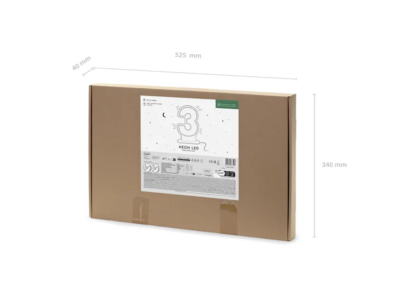 Neon LED – Cyfra ”3” w kolorze białym na przeźroczystym tle o ciepłej białej barwie światła, wysokość ok. 50 cm, długość kabla z wtyczką ok. 1,5 m. Możliwość regulacji intensywności świecenia. Zestaw zawiera NEON, podstawkę do postawienia cyfry i wieszak do mocowania na ścianie. Moc znamionowa: 8-10W, napięcie znamionowe: 5V, rodzaj wtyczki: USB.