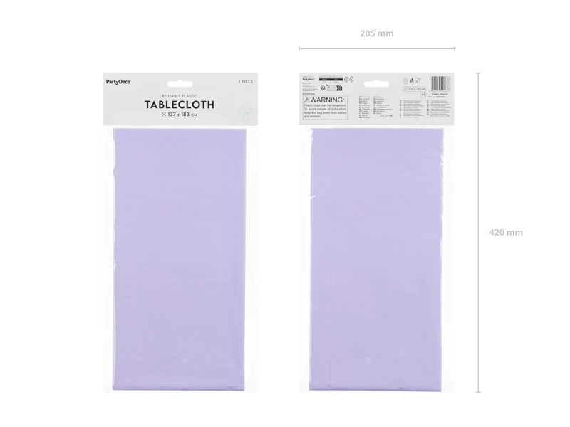 Obrus w kolorze lawendowym. Rozmiar ok. 137 x 183 cm. Obrus wykonany z materiału syntetycznego.