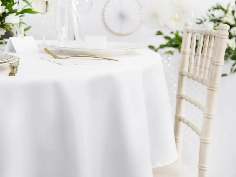 Obrus na stół z matowego materiału w kolorze białym, okrągły, średnica 300 centymetrów.
