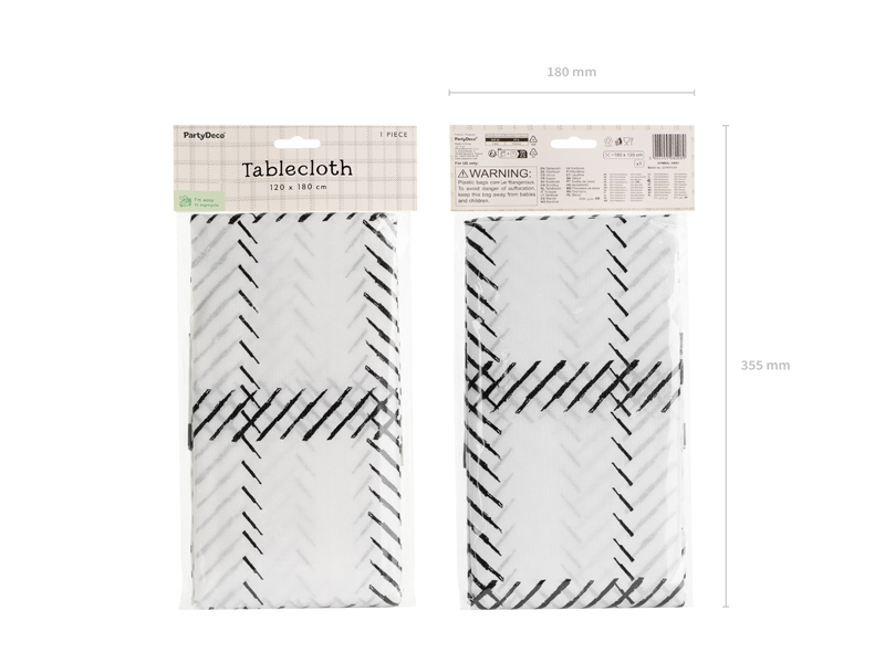 Obrus jednostronny i jednorazowy o długości 180 cm i szerokości 120 cm, mix kolorów. Obrus z nadrukowanymi czarnymi kokardkami i kratką.