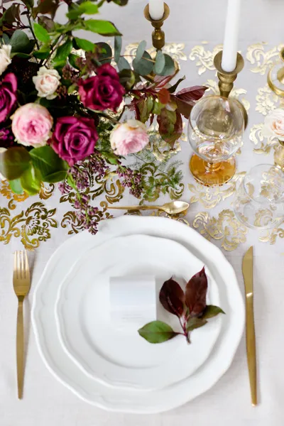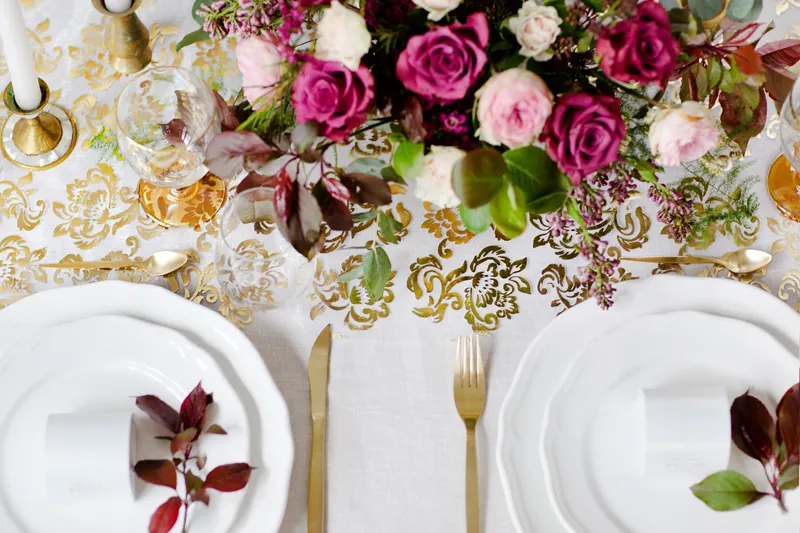 Organza w kolorze białym ze złotym nadrukiem (lewa strona nadruku w kolorze srebrnym), wymiary 0,36×9 metrów.
