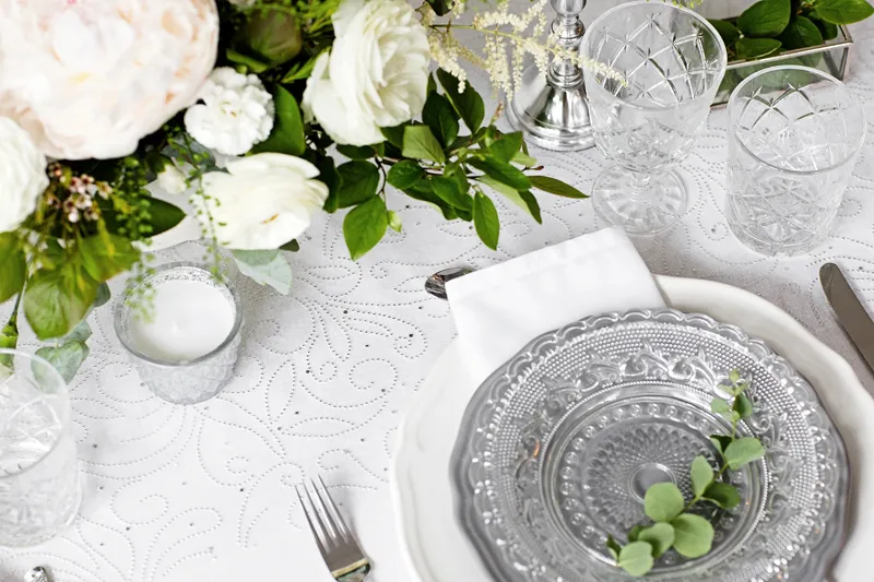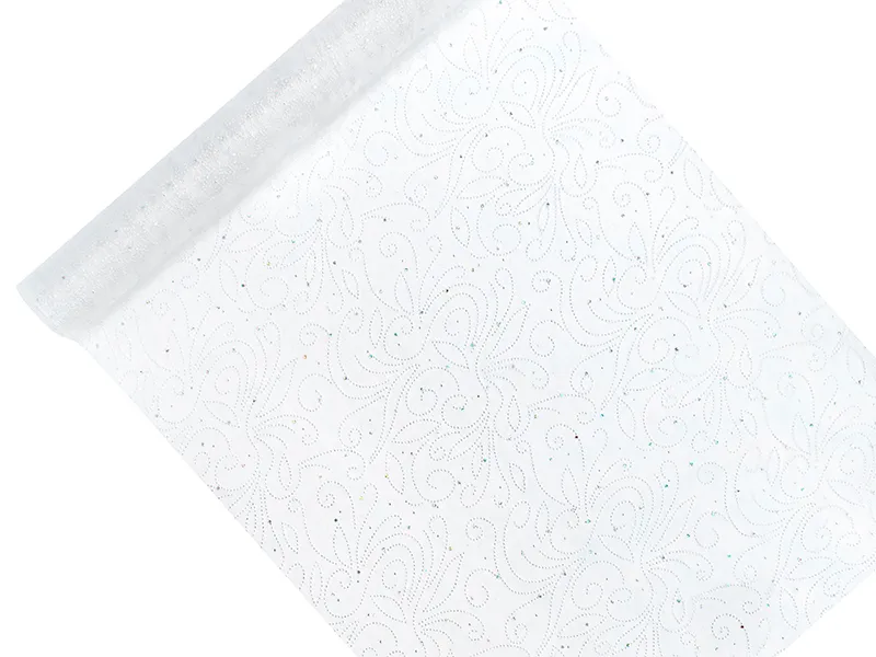 Organza w kolorze białym z perłowym, jednostronnym nadrukiem, wymiary 0,48×9 metrów.