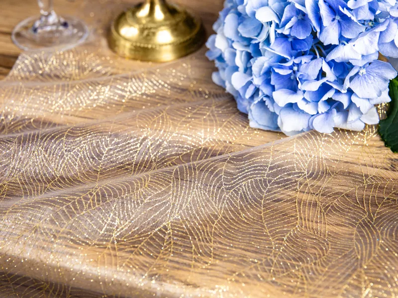 Organza w kolorze białym ze złotym, jednostronnym nadrukiem, wymiary 0,48×9 metrów.
