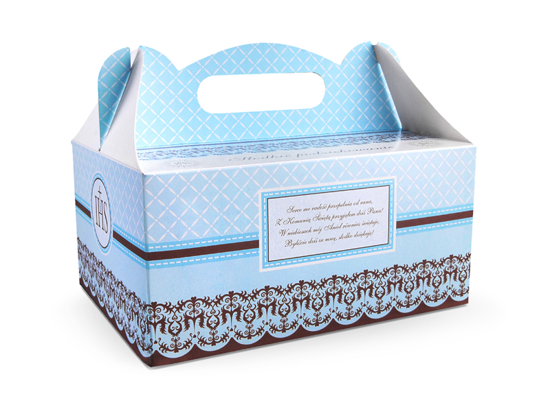Ozdobne pudełka na ciasto komunijne z papieru z niebieskim nadrukiem i wierszykiem, wymiary pudełka po złożeniu 19x14x9 centymetrów. (1 op. / 10 szt.)