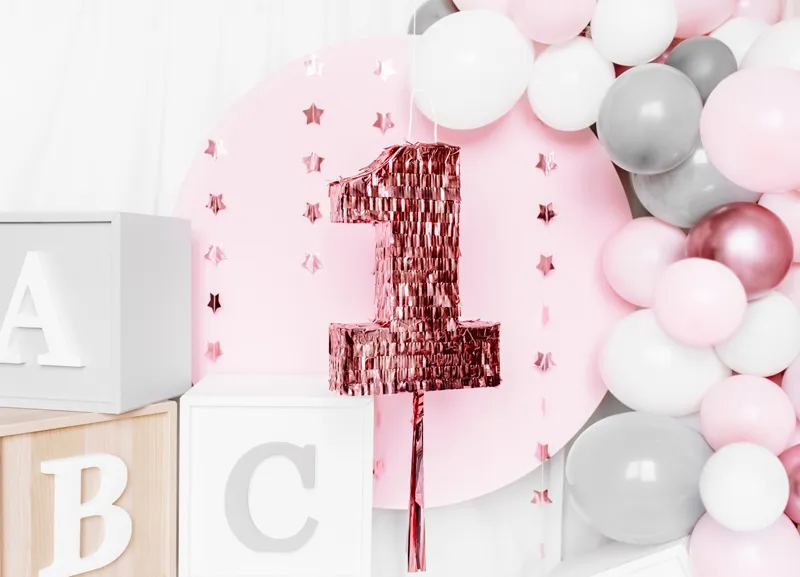 Piniata w kształcie cyfry 1 w kolorze różowego złota, do wypełnienia upominkami, wymiary ok. 28.5 x 40.5 x 8 cm.