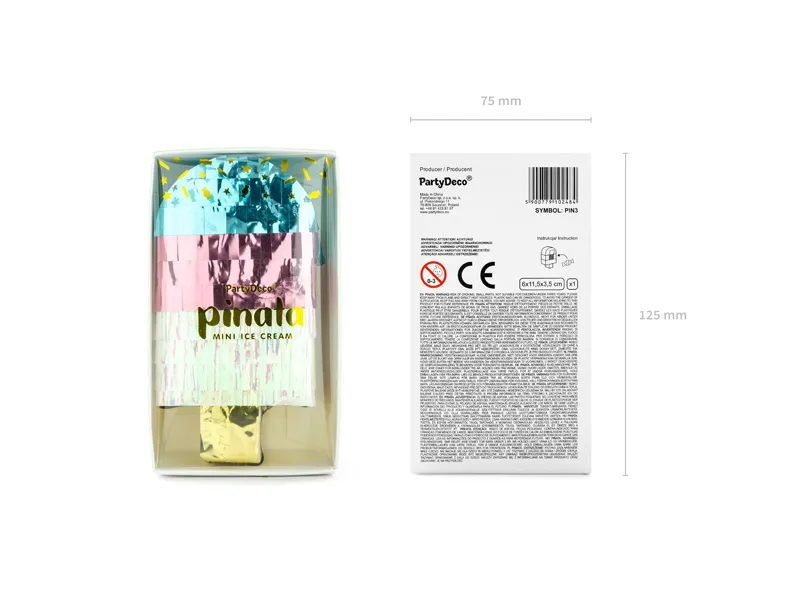 Piniata w kształcie lodu do wypełnienia upominkami, mix kolorów, posiada zawieszkę do mocowania, wymiary ok. 6 x 11,5 x 3,5 cm.