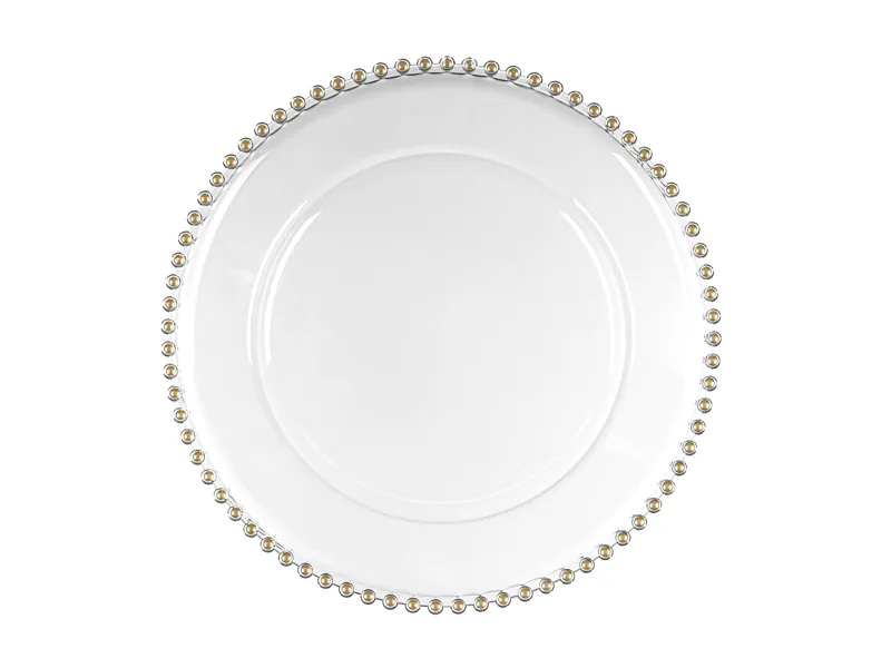 Podtalerz z perłami wykonany z transparentnego plastiku, średnica ok. 32 cm i głębokość 3 cm.