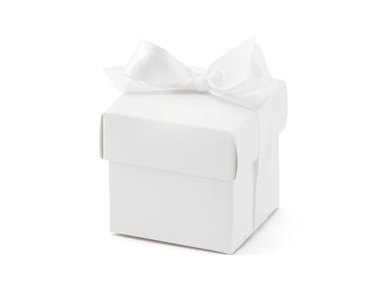 Pudełeczka wykonane z papieru w kolorze białym, z satynową tasiemką, idealne na prezenciki dla gości, wymiary po złożeniu 5,2×5,2×5,2 centymetra. (1 op. / 10 szt.)