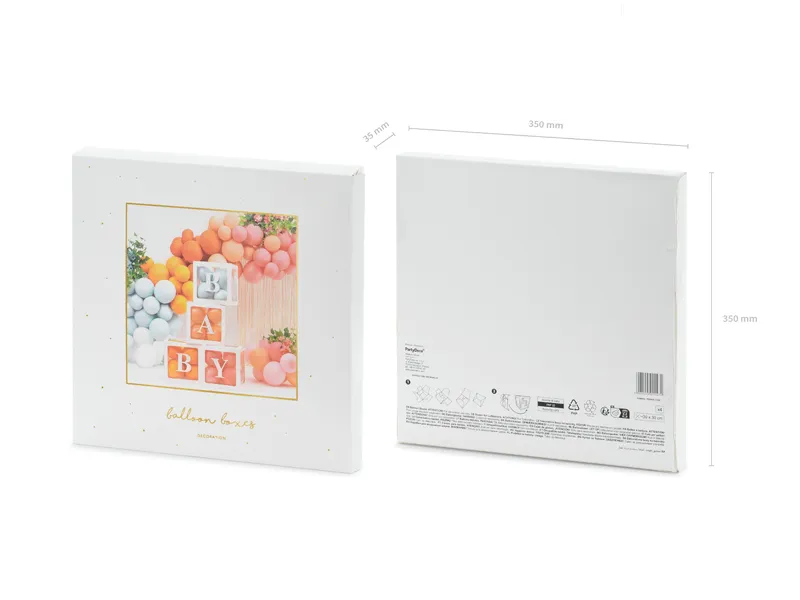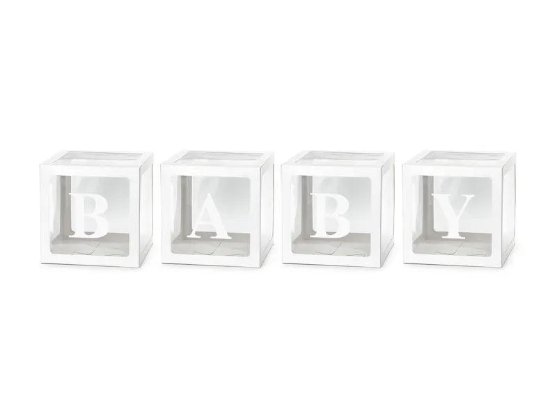 Zestaw 4 pudełek na balony oraz naklejane literki BABY w kolorze białym. Pudełka po złożeniu o wymiarach 30 x 30 cm. Produkt do samodzielnego złożenia. (1 op. / 4 szt.)