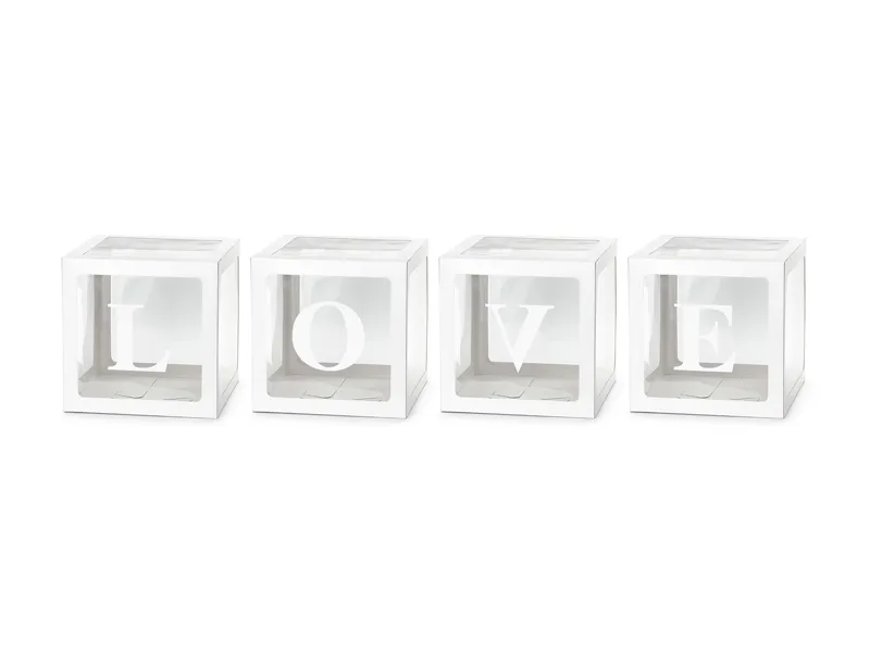 Zestaw 4 pudełek na balony oraz naklejane literki LOVE w kolorze białym. Pudełka o wymiarach 30 x 30 cm. Produkt do samodzielnego złożenia. (1 op. / 4 szt.)