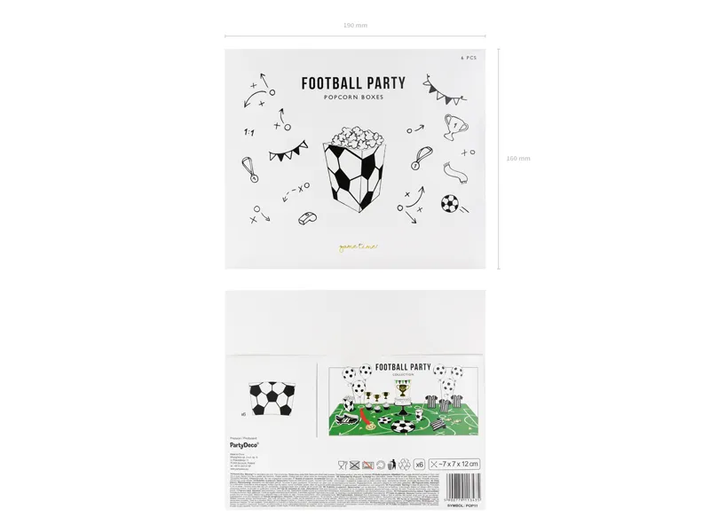 Każde pudełko ma wymiary około 7 × 7 × 12 cm, co sprawia, że doskonale nadają się do serwowania ulubionych przysmaków w wygodny i atrakcyjny sposób. W zestawie znajduje się 6 sztuk pudełek, które z łatwością można ustawić na stole, tworząc efektowną, piłkarską aranżację. Dzięki nim każdy mały i duży kibic będzie miał pod ręką smaczną przekąskę, dodając jeszcze więcej radości do piłkarskiego przyjęcia.