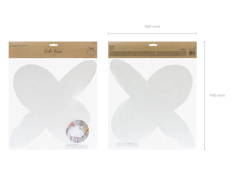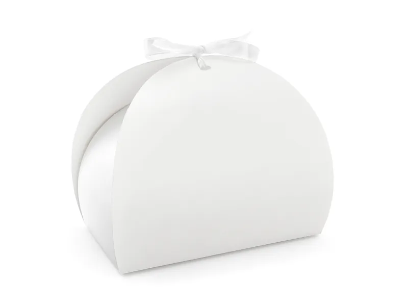 Pudełko na ciasto wykonane z papieru w kolorze białym z białą tasiemką, szerokość ok. 16,5 cm, wysokość ok. 14 cm, głębokość ok. 9,5 cm. Dlugość tasiemki 40 cm. (1 op. / 10 szt.)