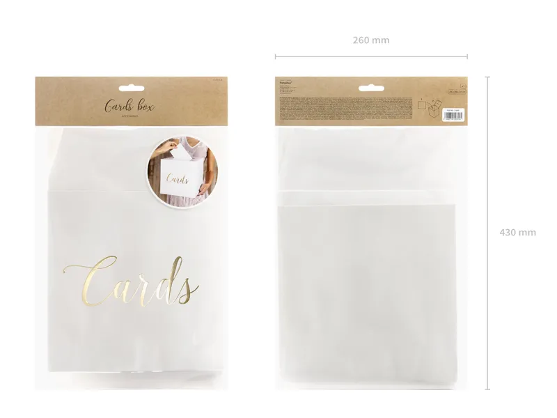 Pudełko na koperty wykonane z białego papieru ze złotym metalizowanym napisem Cards, wymiary po złożeniu ok 24 x 24 x 24 cm.