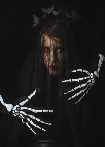 Rękawice świecące w ciemności, w kolorze czarnym z motywem ręki kościotrupa o rozmiarze S/M, długość ok. 39.5 cm, obwód ok. 30 cm. Skład: poliester – 100%. Sposób konserwacji: prać ręcznie.