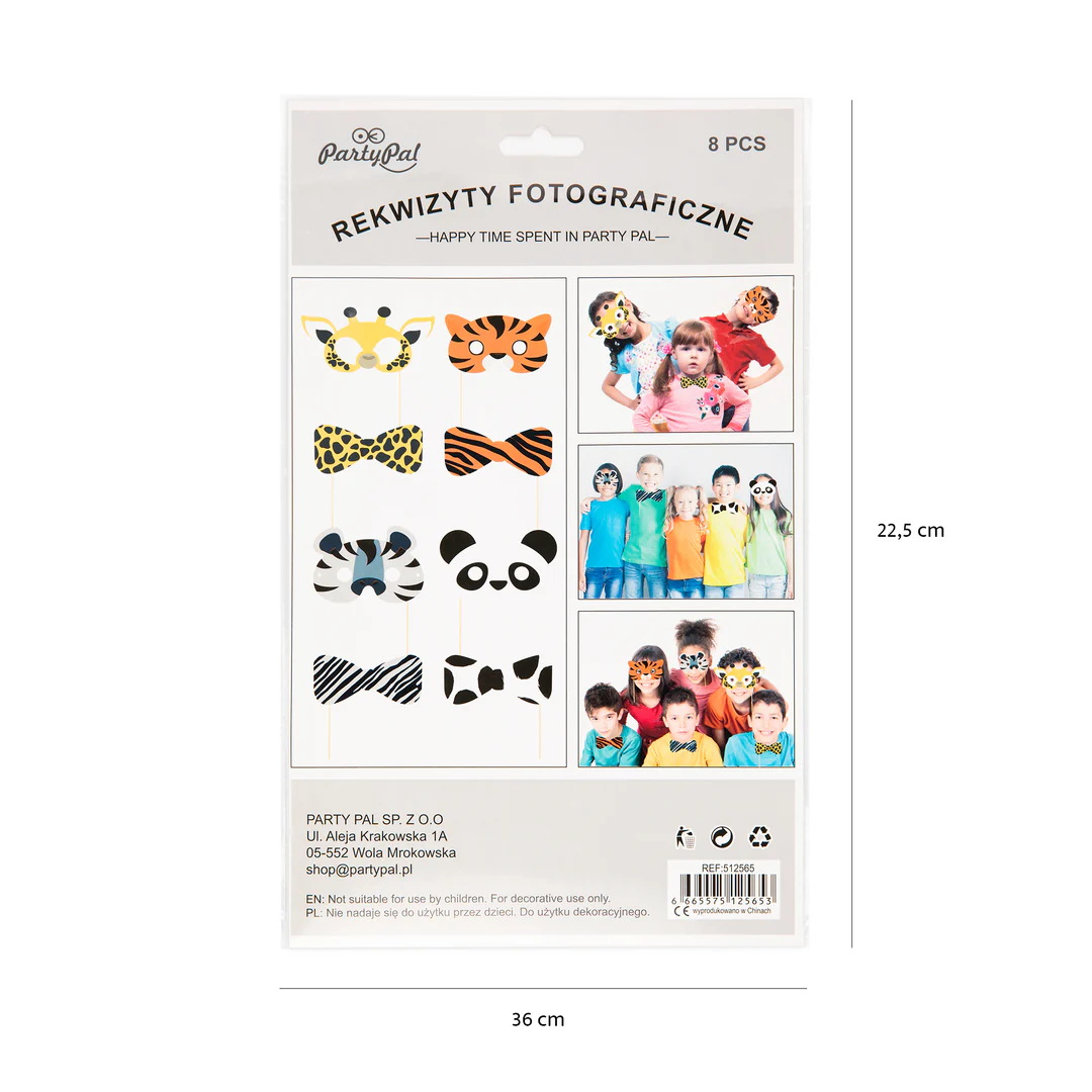 Rekwizyty fotograficzne w kształcie pyszczków zwierzątek i muszek. W skład zestawu wchodzą maski żyrafy, pandy, zebry i tygrysa oraz 4 szt. muszek pasujących wzorami i kolorystycznie do masek.
