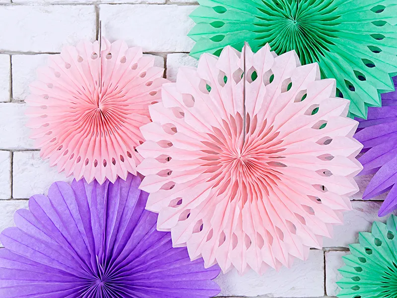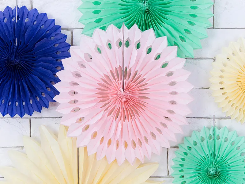 Rozety dekoracyjne wykonane z bibuły w kolorze jasnego pudrowego różu, średnice po złożeniu ok. 20 cm, 25 cm i 30 cm. (1 op. / 3 szt.)