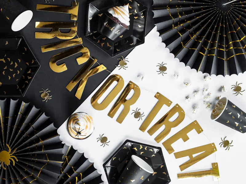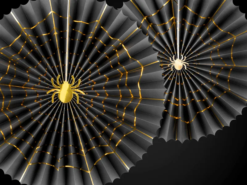 Rozety dekoracyjne Trick or Treat, średnice po złożeniu ok. 32 cm i 40 cm. Zestaw zawiera rozety (2 szt.) i złote pająki (2 szt.) (1 op. / 2 szt.)