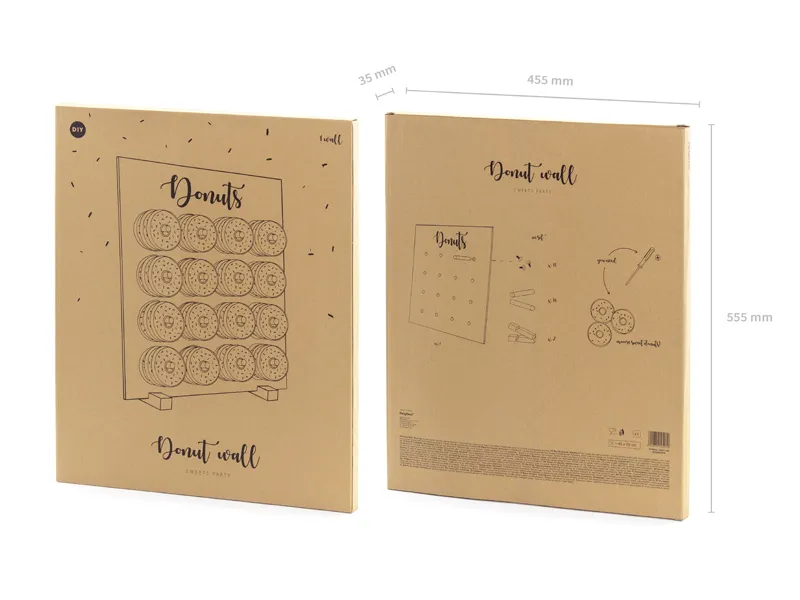 Drewniana Ściana na Donuty z 16 kołkami do samodzielnego zamontowania, szerokość ok. 45 cm, wysokość ok. 55 cm.