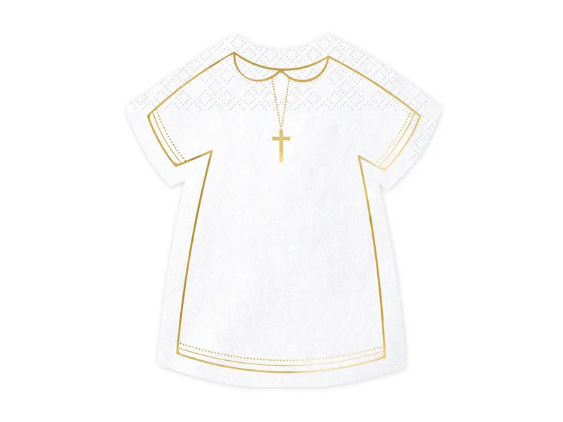 Serwetki papierowe w kształcie alby komunijnej w kolorze białym ze złotym metalizowanym nadrukiem, wymiary po rozłożeniu ok. 28 x 32 cm, wymiary po złożeniu ok. 14 x 16 cm. (1 op. / 20 szt.)