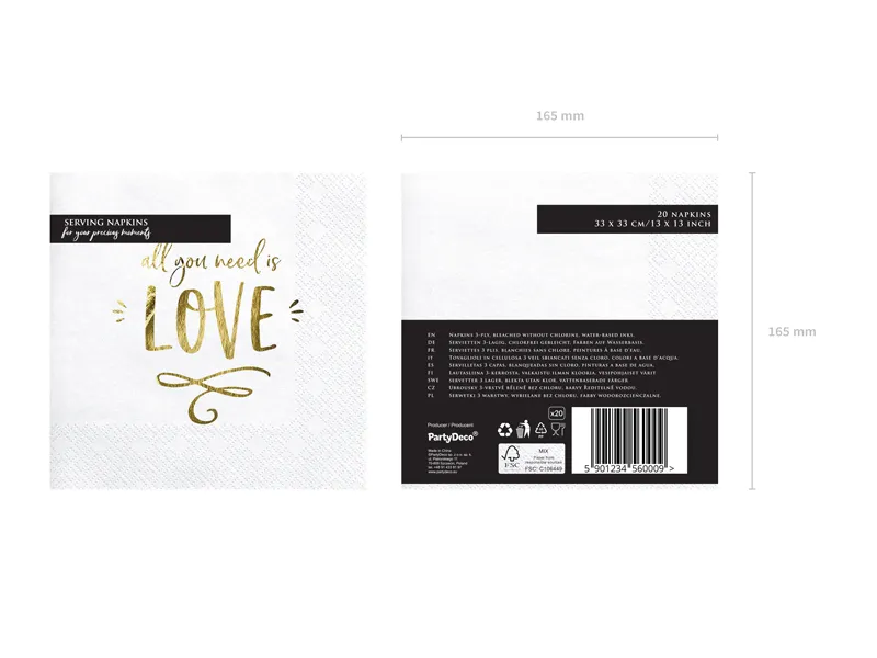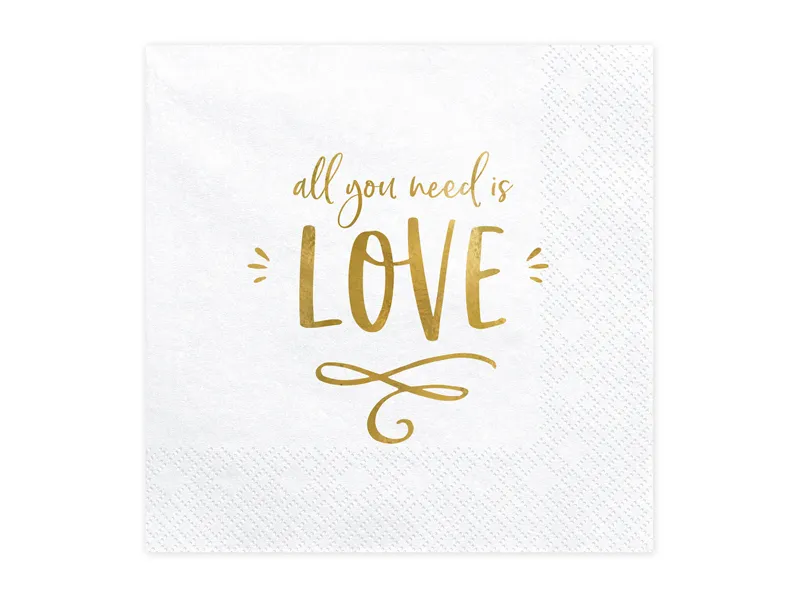 Serwetki papierowe w kolorze białym, ze złotym metalizowanym napisem All you need is love, wymiary po rozłożeniu ok. 33 x 33 cm, wymiary po złożeniu ok. 16,5 x 16,5 cm. (1 op. / 20 szt.)