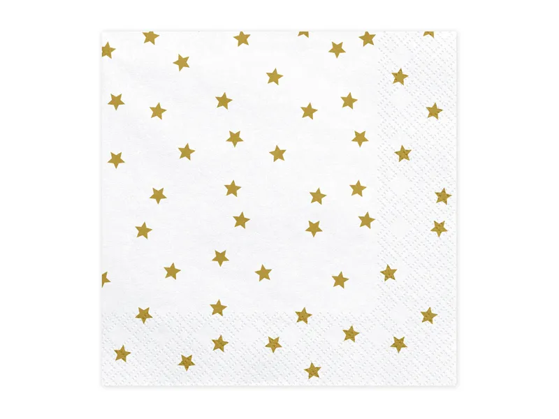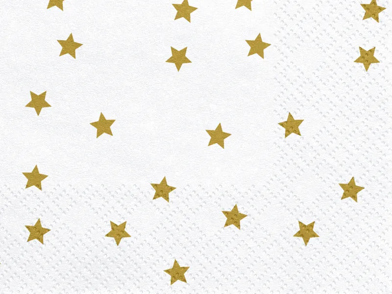 Serwetki papierowe Gwiazdki w kolorze białym ze złotym nadrukiem, wymiary po rozłożeniu ok. 33 x 33 cm, wymiary po złożeniu ok. 16,5 x 16,5 cm. (1 op. / 20 szt.)