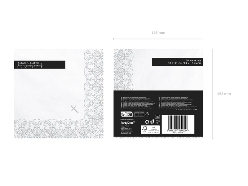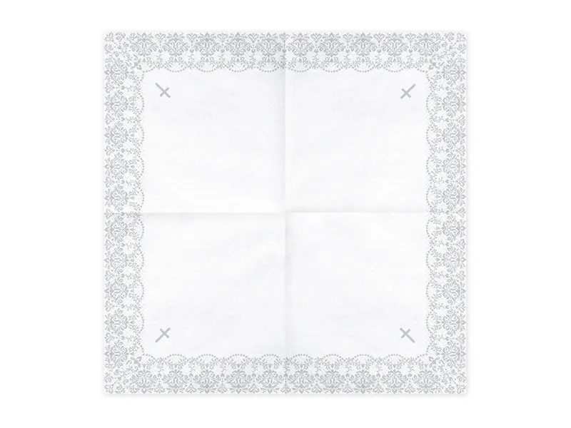 Serwetki papierowe białe ze srebrnym ornamentem, wymiary po rozłożeniu ok. 33 x 33 cm, wymiary po złożeniu ok. 16,5 x 16,5 cm. (1 op. / 20 szt.)