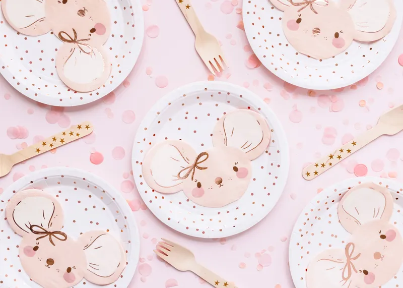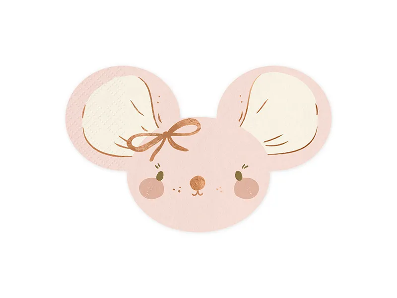 Serwetki papierowe Myszka w jasnoróżowym kolorze z nadrukiem w kolorze różowego złota, wymiary po rozłożeniu ok. 32 x 20 cm, wymiary po złożeniu ok. 16 x 10 cm. (1 op. / 20 szt.)