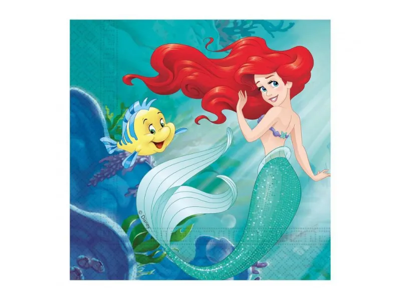 Grafika nadrukowana na serwetkach wyróżnia się wyrazistym wizerunkiem Arielki, ale także detalami tła, delikatnymi falami, bąbelkami, muszlami i kolorowymi chmurkami podwodnej scenerii. Całość prezentuje się bardzo efektownie, zwłaszcza jeśli w otoczeniu znajdą się pozostałe przedmioty z tej samej serii, talerzyki, kubeczki, girlandy czy obrus. Dzięki temu stół przyjęcia wygląda spójnie i zyska bajkowy charakter.