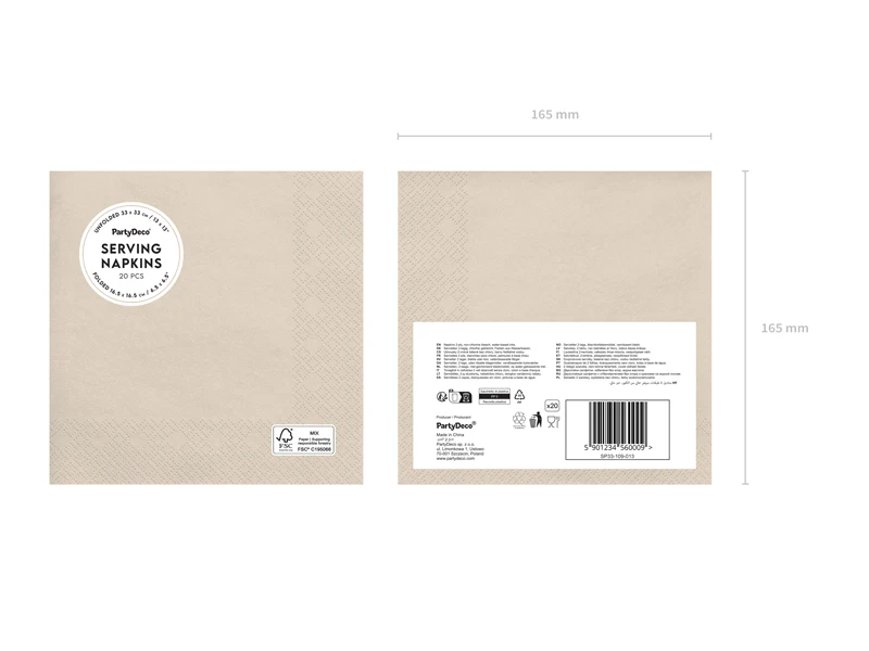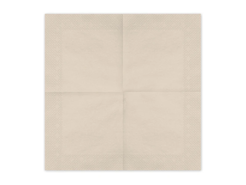 Serwetki papierowe w kolorze beżowym. Wymiary po rozłożeniu ok. 33 x 33 cm, wymiary po złożeniu ok. 16,5 x 16,5 cm. (1 op. / 20 szt.)