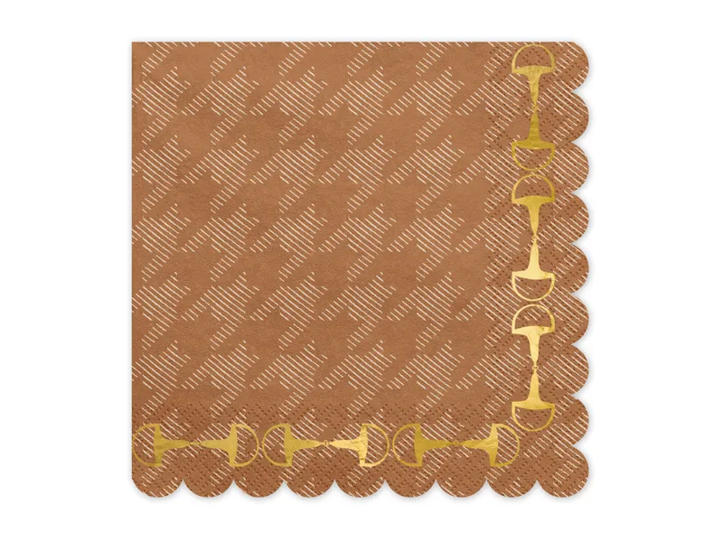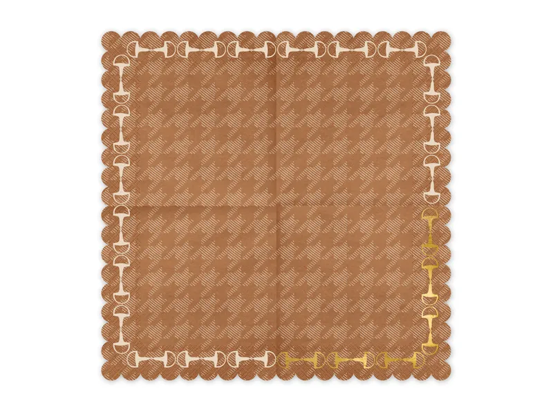 Brązowe, papierowe serwetki w pepitkę ze złotym, błyszczącym nadrukiem strzemion. Wymiary po rozłożeniu ok. 33 x 33 cm, wymiary po złożeniu ok. 16.5 x 16.5 cm. (1 op. / 12 szt.)