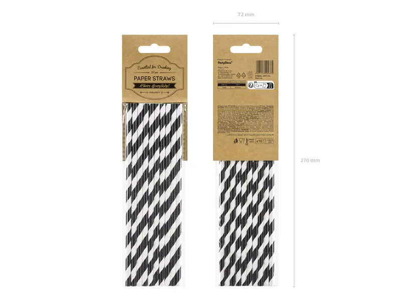 Słomki papierowe w kolorze czarnym z białymi ukośnymi paskami, długość około 19,5 centymetra. (1 op. / 10 szt.)