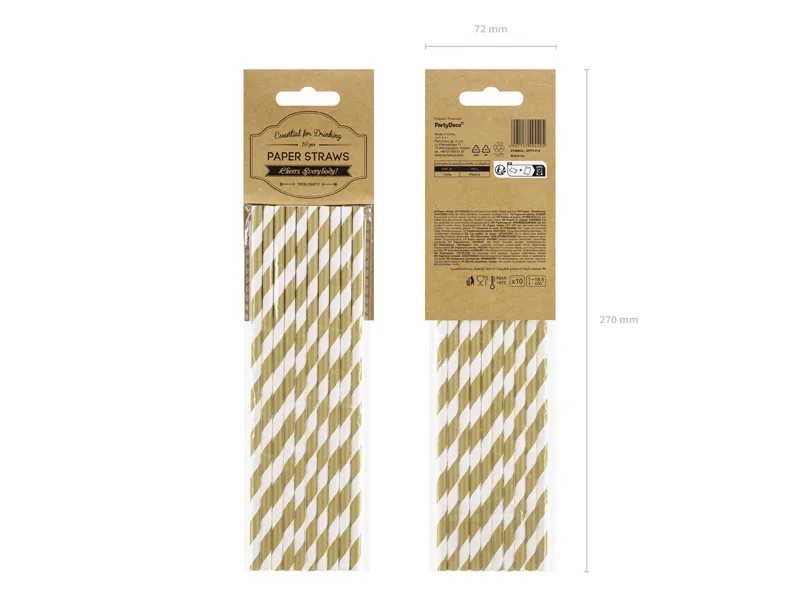 Słomki papierowe w kolorze złotym z białymi ukośnymi paskami, długość około 19,5 centymetra. (1 op. / 10 szt.)