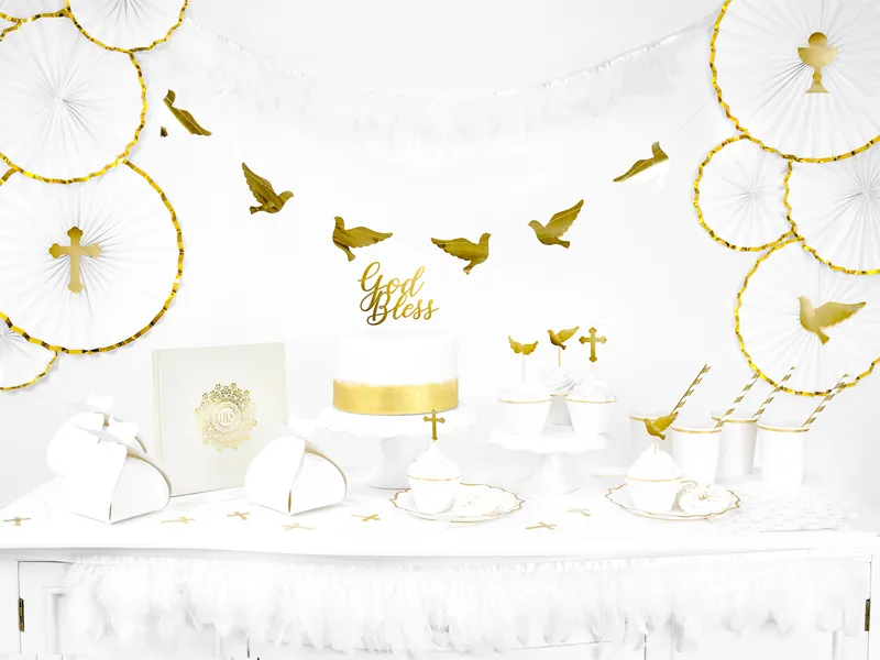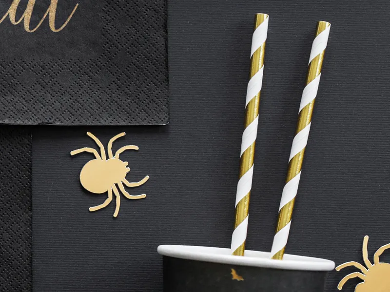 Słomki papierowe w kolorze złotym, metalizowanym z białymi ukośnymi paskami, długość ok. 19.5 cm. Towar nie może być sprzedawany na terytorium RFN i Szwajcarii, w związku z wewnętrznymi regulacjami prawnymi Niemiec i Szwajcarii. Towar zgodny z przepisami Unii Europejskiej. (1 op. / 10 szt.)