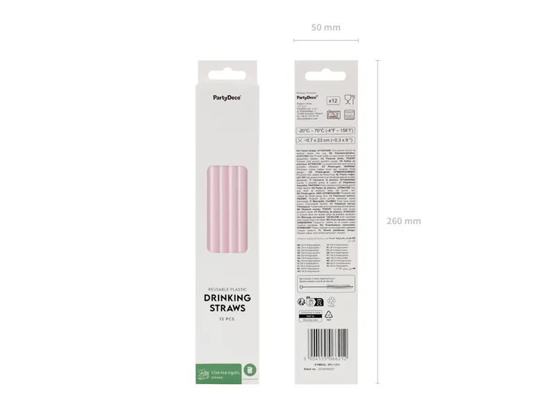 Słomki plastikowe w kolorze różowym, średnica ok. 7 mm, długość ok. 23 cm. Zestaw zawiera czyścik. Produkt wielokrotnego użytku. (1 op. / 12 szt.)